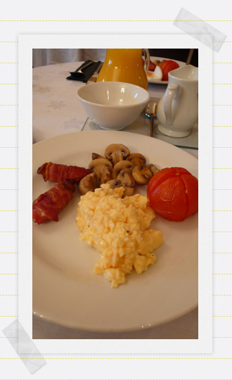 前日に、HOTメニュー(ベーコン、エッグ、トマト、マッシュルームetc…)のリクエストをチェックシートに書いて出しておくとそれを用意してくれます。飲み物は席に着いた時に、珈琲、紅茶、ジュース等から好きなものを言うと持ってきてくれました。