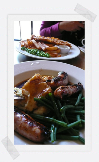 私はリンゴ入りソーセージ&マッシュポテト、マダムはフィッシュ&チップス。