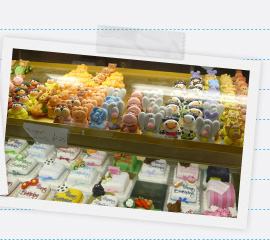 こちらのケーキは、キャラものとかとにかく味より見た目って感じですごくキレイ。色もバキバキ。