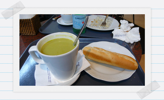 マダムと合流して、館内のカフェでランチ。またエンドウ豆のスープ(?)とパン。