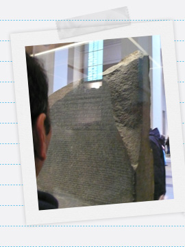 1階にある細長い展示スペースを少し歩くと、ひと際目立つ人だかりがあって、これがミイラかな?とのぞくと、「ロゼッタストーン」でした。